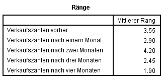 Zehn Mitarbeitende eines Unternehmens nehmen an einer Verkaufsschulung teil. Es soll untersucht werden, ob sich die Schulung auf die Verkaufszahlen auswirkt. Daher werden für jeden Mitarbeitenden die Verkaufszahlen vor der Schulung, im ersten, zweiten, dritten und vierten Monat danach erhoben. Zeigen sich Unterschiede zwischen den Messzeitpunkten? Da die Stichprobe klein ist (n = 10) wird ein Friedman-Test durchgeführt.